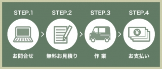 | 一度訪問させていただき、お見積りを作成いたします。 作業日程などもご相談下さい。 ※作業の内容によりましては、お電話でお見積りをさせて頂く場合もございます。 ※お見積りは無料です。 |